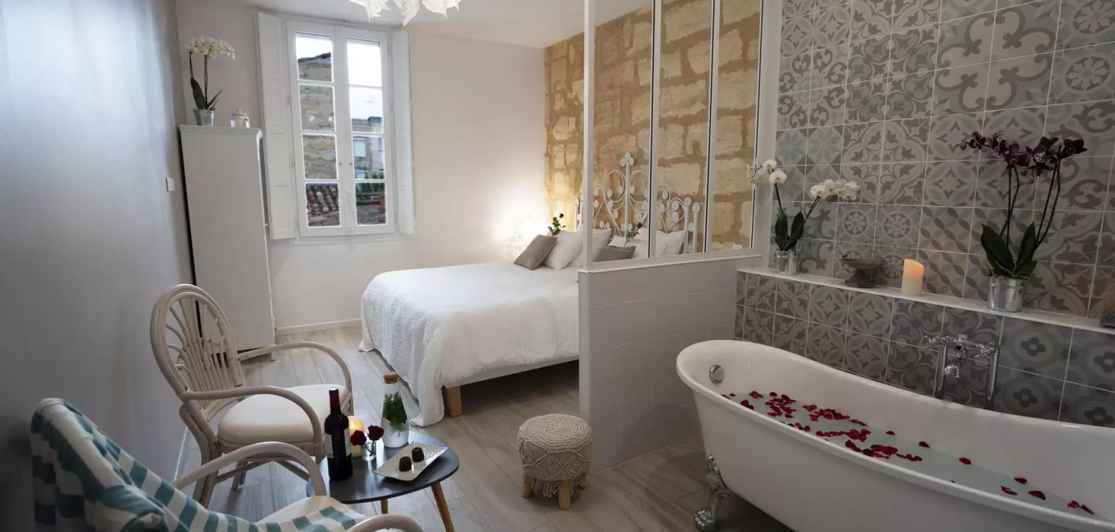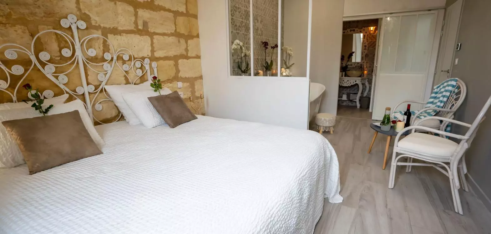 C’est dans cette ville aux mille visages que notre commerçant a rencontré celle qui allait devenir le grand amour de sa vie. Notre chambre d’hôtes Romantique est une ode à cette histoire où la passion a prévalu sur toute autre considération. Comme notre marchand, vous profitez dans cette pièce d’un décor doux et lumineux dans lequel trônent un large lit double, une baignoire pour prendre un bain à deux, une petite douche pour se rafraichir, et un coin salon au cœur duquel savourer un verre de bon vin ou une coupe de champagne. Charme, caractère douillet : on imagine notre Girondin perdre toute envie d’en quitter les murs… Et vous ?